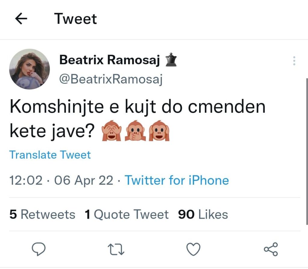 Pavarësisht kritikave apo interpretimeve që iu bënë këtij komenti, Beatrix duket se po e përdor për marketing.Ajo ka postuar sot një status në Twitter ku shkruan “Komshinjtë e kujt do çmenden këtë javë”. Kaq ka mjaftuar që ndjekësit të shpërthejnë në komente, disa suportues, e të tjerë kritikë. Nuk dihet për çfarë e ka fjalë ajo por ka dyshime se po flet për këngën e re.