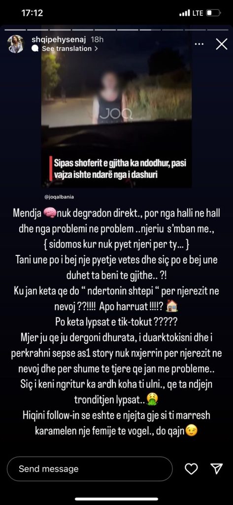 “Ku janë këta që do të ndërtonin shtëpi për njerëzit në nevojë? Apo harruat? Po këta lypsat e Tik Tokut? Mjerë ju që dërgoni dhurata, i duatrokisni dhe i përkrahni sepse asnjë story nuk nxjerrin për njerëzit në nevojë dhe për shumë të tjerë që janë me probleme…siç i keni ngritur ka ardhur koha t’i ulni që ta ndjejnë tronditjen lypsat. Hiqini follow-in se është e njëjta gjë si t’i marrësh karamelen një fëmijë të vogël, do qajnë”.
