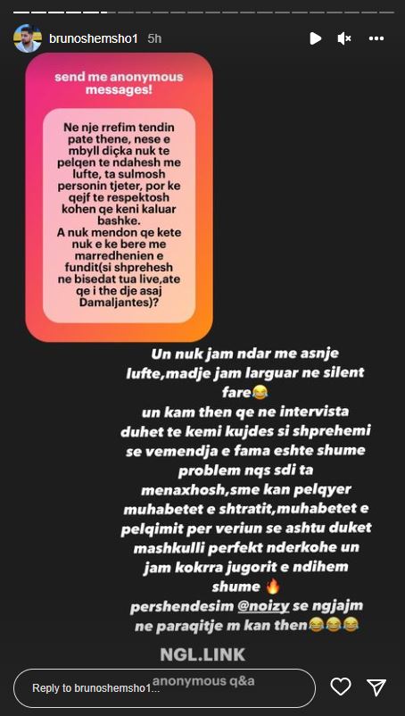 “Unë nuk jam ndarë me asnjë luftë, madje jam larguar në silent fare. Unë kam thënë që në intervista duhet të kemi kujdes si shprehemi se vëmendja e fama është shumë problem nqs sdi ta menaxhosh. S’më kanë pëlqyer muhabetet e shtratit, muhabetet e pëlqimit për veriun se ashtu duket mashkulli perfekt ndërkohe un jam kokrra jugorit e ndihem shumë zjarr. Përshendesim @noizy se ngjajm në paraqitje me kan thëne”- shkruan Bruno në përgjigjen e publikuar në Instastory.