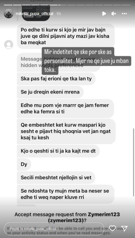 “Po edhe ti k*rvë si kjo je. Mirë iua bëjnë juve që dilmi pini aty. Më keq iua kisha bërë. S’ka pasur faj Erioni që të ka lënë. Se ju dreqin e keni brenda. Po më vjen turp që jam femër edhe ka femra si ti që mbështet këtë k*rvë. Së pari kjo nuk është e prië fare, shoqëria e saj janë afër saj duke qeshur. Kjo është kështu si ti. Secili mbështet llojin e vet. Se ndoshta ty mundet të ta bëjnë nesër se ti vetëm klubeve rri”- thuhet në mesazhet e publikuara, krahas së cilëve Mikela shkruan: “Mirë identitet që s’ke por s’ke as personalitet. Mjerë ne që juve ju mban Toka.”
