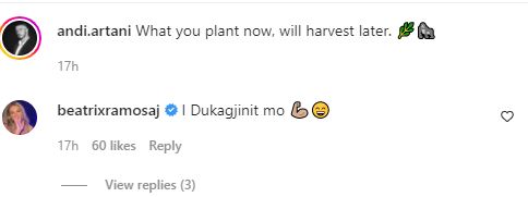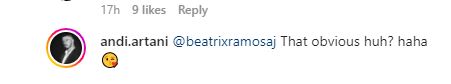 Ky koment i ka nxitur edhe me tepër ndjekësit, duke marrë pëlqime të shumta. Andi Artani nuk ka humbur asnjë moment për ti kthyer përgjigje Beatrixës.