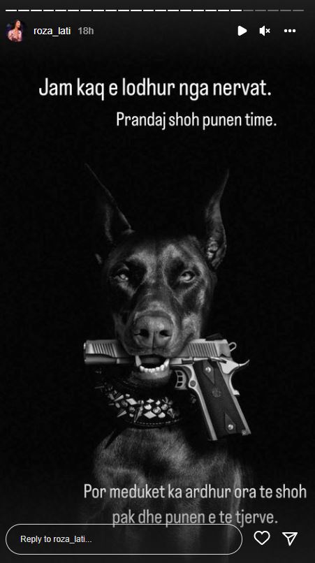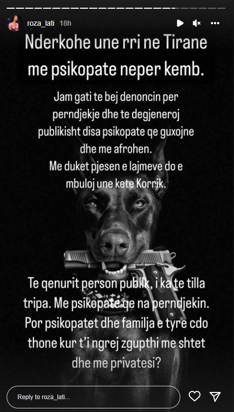 Të qenurit person publik, i ka të tilla tripa. Me psikopatët dhe familja e tyre çdo thonë kur t’i ngrej zgupthi me shtet dhe privatësi?”– shkruan Roza Lati në Instastory, duke vijuar më tej me një tjetër postim ku shton: “Jam kaq e lodhur nga nervat, prandaj shoh punën time. Por më duket se ka ardhur koha të shoh pak dhe punën e të tjerëve”
