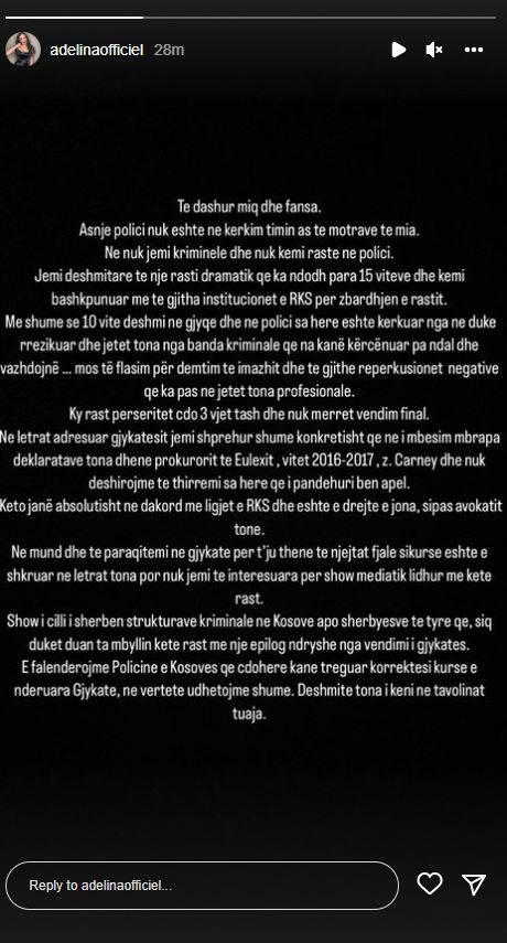 “Të dashur miq dhe fansa. Asnjë polici nuk është në kërkim timin as të motrave të mia. Ne nuk jemi kriminele dhe nuk kemi raste në polici. Jemi dëshmitare të një rasti dramatik që ka ndodhur para 15 vitesh dhe kemi bashkëpunuar me të gjithë institucionet e Republikës së Kosovës për zbardhjen e rastit. Më shumë se 10 vite dëshmi në gjyqe sa herë është kërkuar nga ne duke rrezikuar jetët tona nga banda kriminale që na kanë kërcënuar pa ndalur dhe vazhdojnë. Mos të flasim për dëmtim të imazhit dhe të gjithë reperkusionet negative që ka pasur në jetët tona profesionale.Ky rast përsëritet çdo 3 vjet tani dhe nuk meret një vendim final.