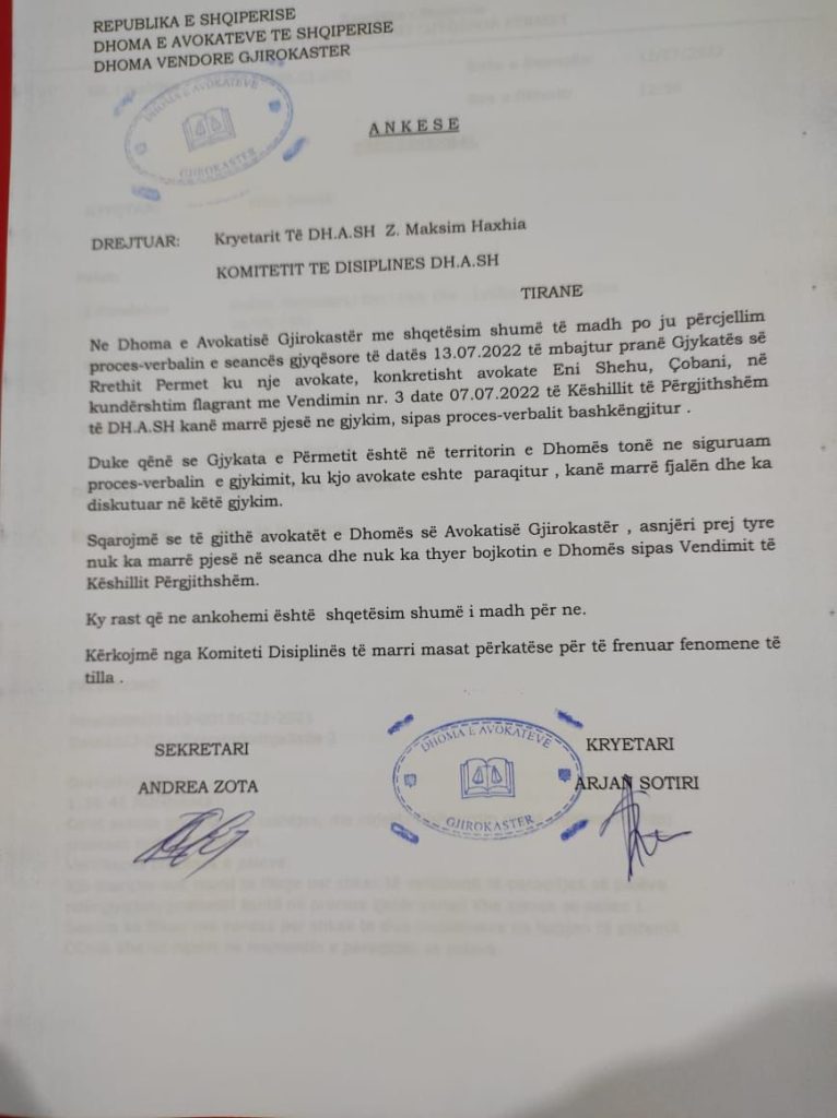 Dhoma e Avokatisë se Gjirokastrës ku pjesë janë edhe avokatët e Përmetit, ka siguruar procesverbalin e seancës gjyqësore në Gjykatën e Përmetit dhe bashkë me të, i ka dërguar Komitetit te Disiplinës të Dhomës Kombëtare të Avokatisë në Tiranë, një ankesë ku i kërkohet marrja e masave ndaj Eni Çobanit me heqjen e licencës.
