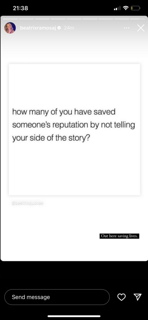 Këngëtarja është goxha aktive në rrjetet e saj sociale dhe teksa poston foto dhe video nga më të shumtat, së fundmi ajo ka hedhur një shkrim në InstaStory ku tregon se si ka shpëtuar ‘reputacionin’ e të tjerëve duke mos e zbuluar anën e saj të historisë.