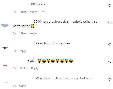 Ndërsa një komentues ironizon: ”Të lumtë Arta Nitaj, e ke pazarin e lartë, 5000 mijë euro s’janë pak. Ke plot baxhella që e shesin për 50 euro”.