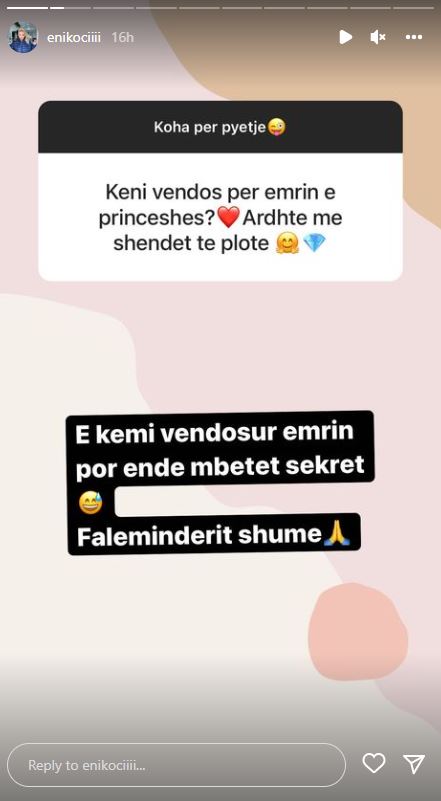 E ndërsa po shijon periudhën më të ëmbël të jetës së saj, Eni ka bërë një bisedë virtuale me ndjekësit ku i kanë shtruar pyetje nga më të ndryshme rreth shtatzanisë apo si do tja vendosin emrin vogëlushes së saj.