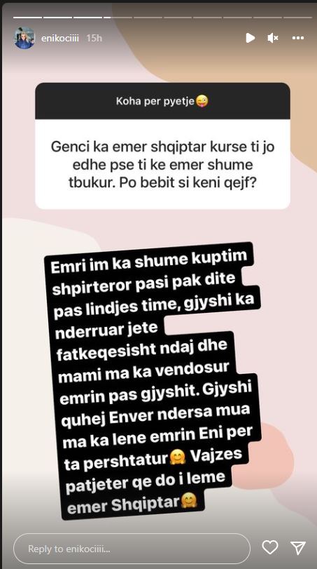 “Emri im ka shumë kuptim sepse pak ditë pas lindjes time, gjyshi im ka ndërruar jetë fatkeqësisht ndaj dhe mami ma ka vendosur emrin pas gjyshit. Gjyshi quhej Enver ndërsa mua ma ka lënë emrin Eni për tu përshtatur. Vajzës patjetër që do i lëmë emër shqiptar”- u shpreh këngëtarja.