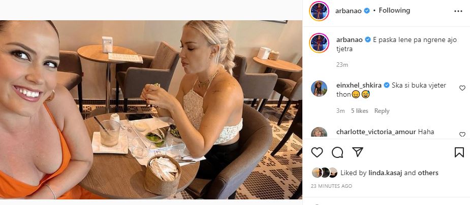 “E paska lënë pa ngrënë ajo tjetra”- shkruan Arbana krahas fotos, duke shkaktuar të qeshura edhe te ndjekësit e saj.