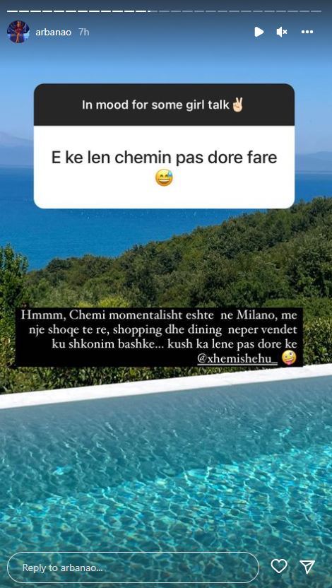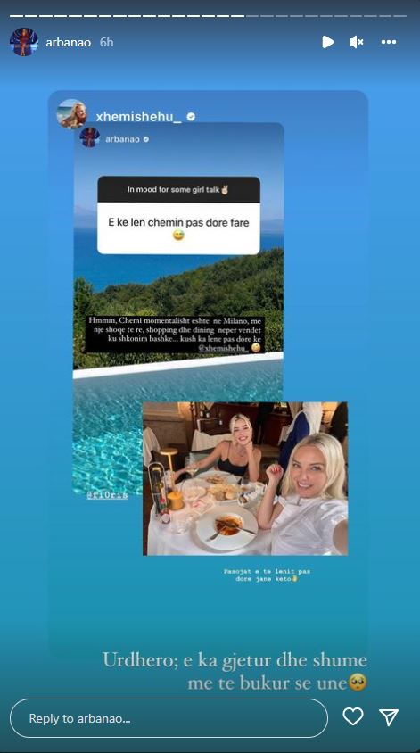 “Xhemi është momentalisht në Milano, me një shoqe të re, shopping dhe dining nëpër vendet ku do të shkonim bashkë… kush ka lënë pas dore kë”- ishte përgjigja e Arbanës, ku kishte etiketuar edhe Xhemin.
