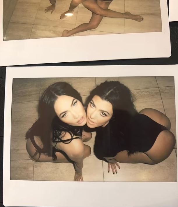 Fotoja e parë tregon Kourtney-n të përkulur në dysheme në një pjesë të dukshme përkrah Megan.
