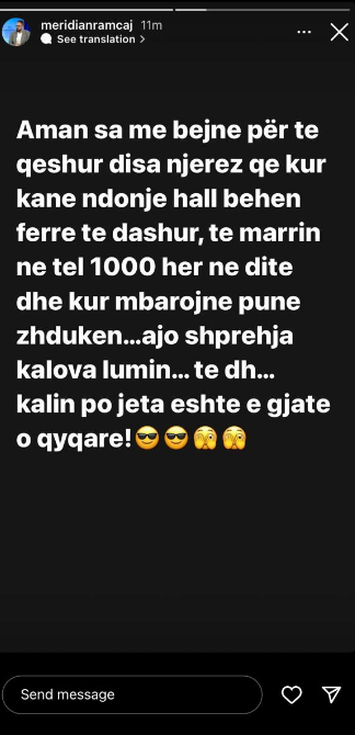 Meridiani ka publikuar një status në Instastory ku shënjestron dikë që sipas tij e ka përdorur për interes. Në statusin e tij Meridiani shkruan: “Aman se më bëjnë për të qeshur disa njerëz që kur kanë ndonjë hall bëhen ferrë të dashur, të marrin në telefon një mijë herë në ditë dhe kur mbarojnë punë zhduken. Ajo shprehja: “Kalova lumin, të dhj*fsha kalin. Po jeta është e gjatë o qyqarë!”