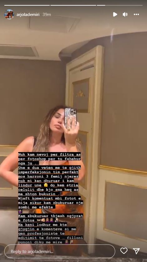 “Nuk kam nevojë për filtra as për fotoshop për tu fshehur nga ju. Unë e dua veten me të gjithë imperfeksionin tim perfket. Mos harroni 3 fëmijë njerëz nuk m’i kanë dhuruar, i kam lindur unë. Do kem strija, celulit dhe kjo s’ma heq as s’ma shton bukurinë. Mjaft komentuat mbi fotot e miia sikur kam zbukuruar një zombie me efekte. Kam zbukuruar thjesht ngjyrat e fotos. Na keni lodhur me këtë gjyqin e komenteve si të jeni profesionistë të editimit të fotove. Filloni punoni diku më mirë”- shkruan Arjola Demiri.