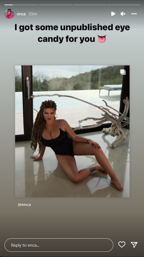 Ndërsa paraqitjen e saj me një set të brendshmesh ngjyrë lejla, Enca jua sërvir fansave si karamele goje.