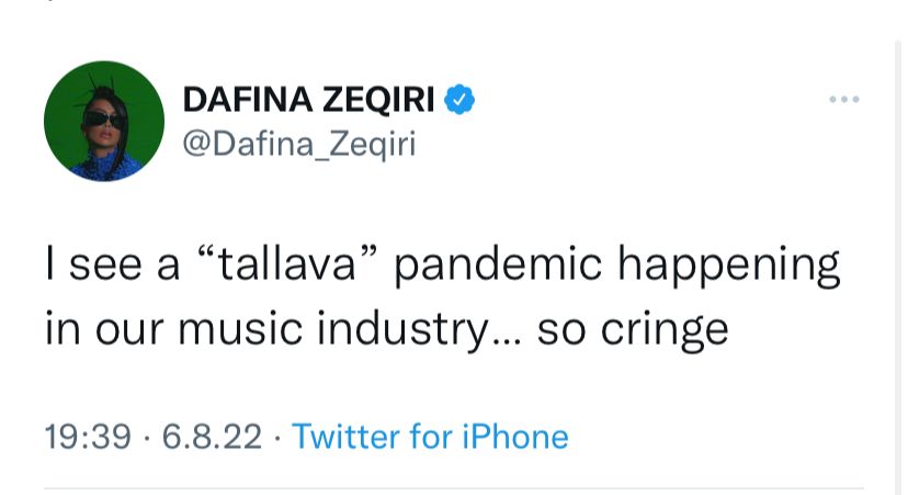“Po shoh një pandemi “tallavaje” që po ndodh në industrinë tonë të muzikës… shumë e turpshme!”- shkruan Dafina në një status në Twitter pa specifikuar se kujt i drejtohet.
