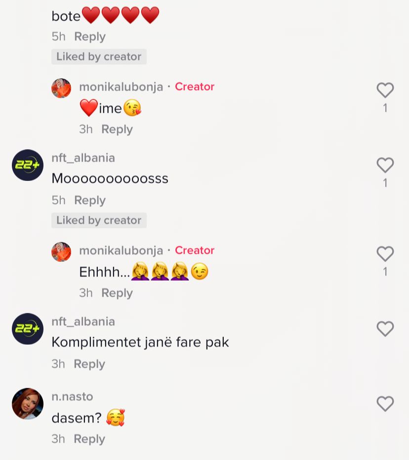 “Moos”- i ka shkruar një ndjekës Monikës, e cila i është përgjigjur me disa emoji që mund të lidhet me acarimin apo mosbesimin, por edhe mund të shprehë humor. Kështu Monika ka reaguar në formë shakaje, pa dhënë një konfirmim konkret. Ndërsa komentit ku ndjekësja e pyet “Dasëm?”, Monika nuk i është përgjigjur.