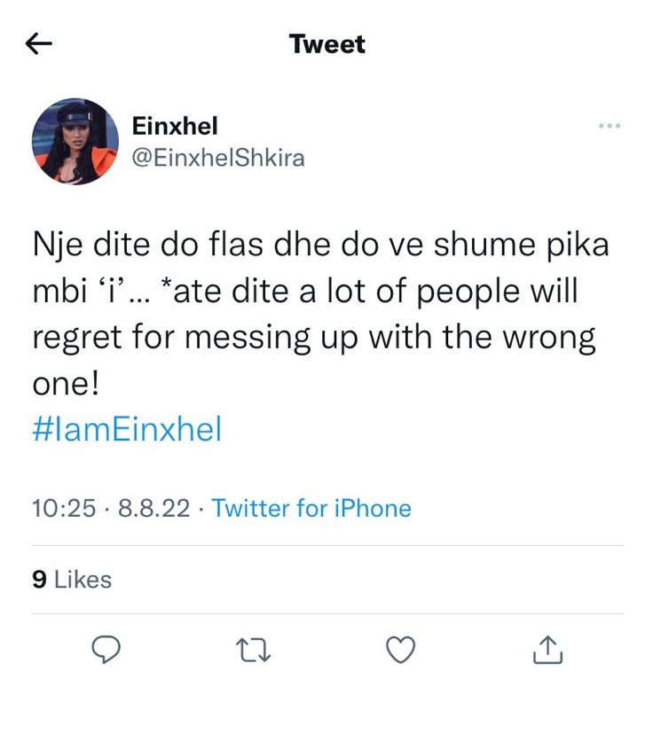 Në një status në Twitter, ish-banorja e “Bug Brother Vip” shkruan: “Një ditë do flas dhe do vë shumë pika mbi “i”… Atë ditë shumë njerëz do pendohen që janë ngatërruar me personin e gabuar”, pa dhënë asnjë detaj më shumë.