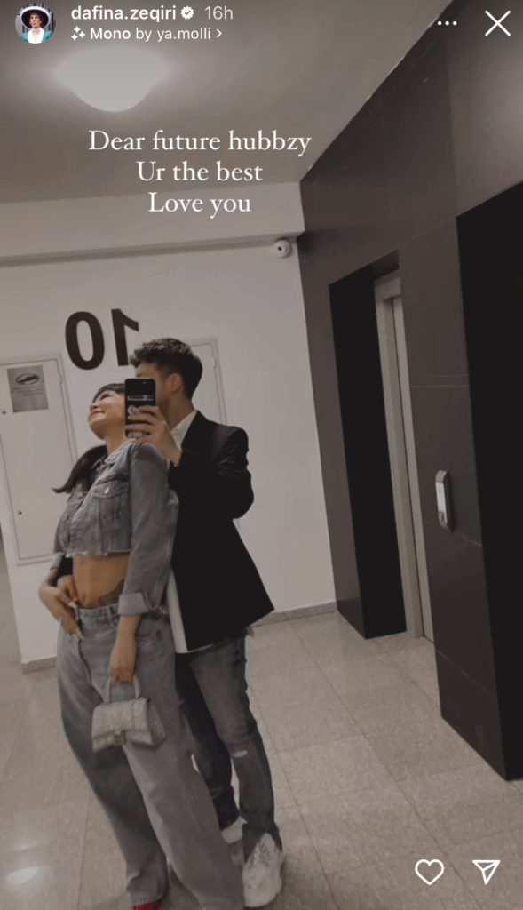 Dafina ka postuar një fotografi ku shihet bashkë me Dj Geek ndërsa ka shkruar: “I dashur bashkëshorti im i ardhshëm, je më i miri. Të dua”.