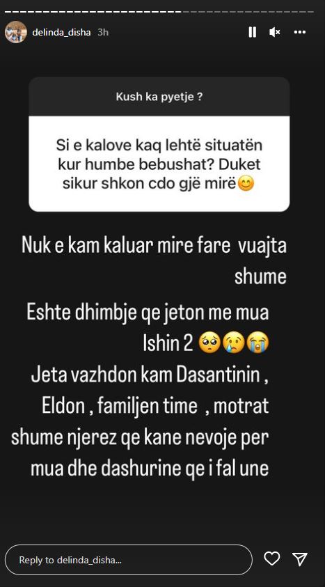“Nuk e kam kaluar mirë fare vuajta shumë. Është dhimbje që jeton me mua. Ishin 2. Jeta vazhdon kam Dasantinin, Eldon, familjen time, motrat, shumë njerëz që kanë nevojë për mua dhe dashurinë që i fal unë”- shkruan Delinda në Instastory.