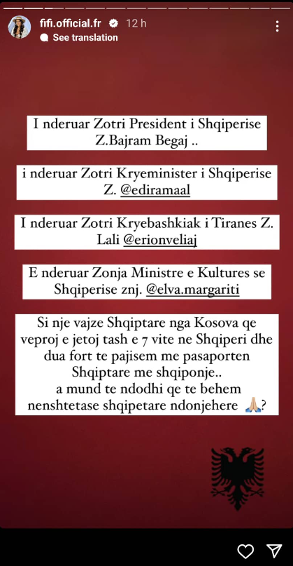 Përmes një postimi në Instagram, Fifi i ka bërë thirrje Presidentit të Shqipërisë Bajram Begaj, Kryeministrit Edi Rama, Kryebashkiakut të Tiranës Erion Veliaj dhe Ministres së Kulturës Elva Margariti që ta shqyrtojnë kërkesën e saj. “Si një vajzë shqiptare nga Kosova që veproj e jetoj tash e shtatë vite në Shqipëri dhe dua fort të pajisjem me pasaportën shqiptare me shqiponjë… A mund të ndodhi që të bëhem nënshtetase shqiptare ndonjëherë?” – ka pyetur Fifi.