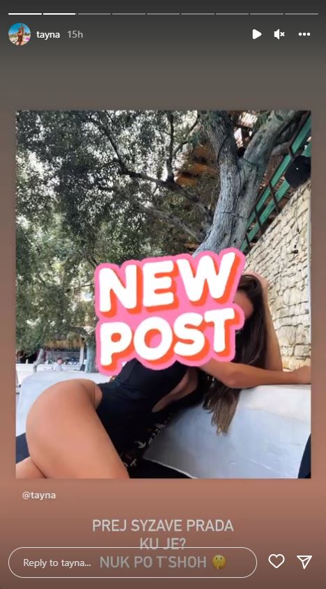 Mirëpo edhe Tayna, nuk ka qëndruar në heshtje. Gjatë ditës së djeshme, reperja është shfaqur tejet sensuale me bikini. Përbri fotos në story Doruntina shkruan: Prej syzeve prada ku je nuk po të shoh,”- fragment ky nga kënga e saj e fundit.