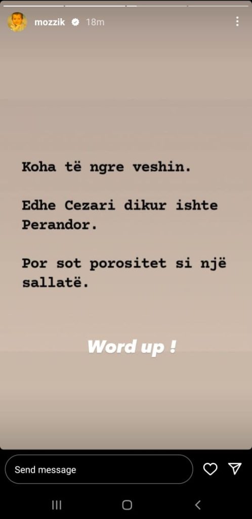 Në një kohë kur kudo flitet rreth prishjes së raporteve të tyre, Mozzik ka zgjedhur të heshtë. Mirëpo, në një status të publikuar së fundmi ai shkruan: “Koha të ngre veshin. Edhe Çezari ishte dikur Perandor. Por, sot porositet si një sallatë”. Duket sikur këto fjalë i drejtohen Noizyt, i cili shpesh i referohet vetes me epitete të ndryshme duke u cilësuar si reperi më i mirë, apo ‘King’.