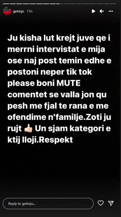 “Ju kisha lut krejt juve që i merrni intervistat e mia ose ndonjë postim timin edhe e postoni nëpër TikTok, ju lutem ndaloni komentet se janë çuar peshë me fjalë të rënda e me ofendime në familje. Zoti ju ruajt. Unë s’jam kategori e këtij lloji. Respekte,”-shkruan Getinjo.