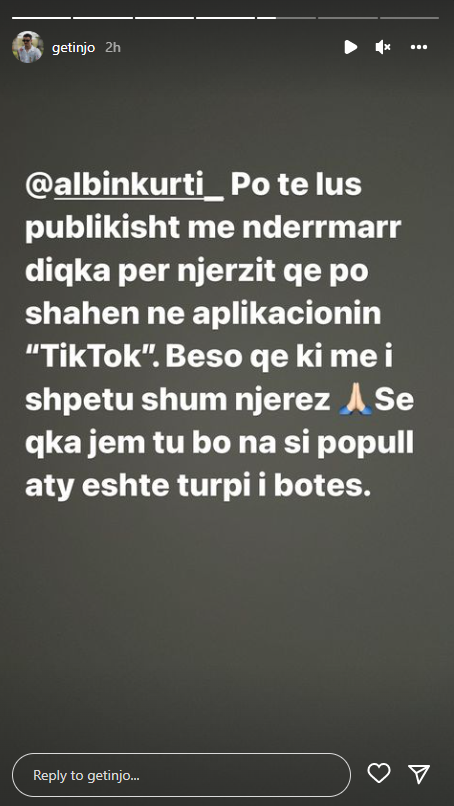 Më herët ju kujtojmë që sërish përmes rrjetit të tij social Instagram, Getoar Aliu i bëri një kërkesë publike kryeministrit të Kosovës, Albin Kurtit. Ai i kërkoi që të bëjë diçka për personat që po shahen në rrjetin social “Tok-Tok”. Sipas reperit, ky veprim do të shpëtonte shumë njerëz.