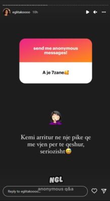 Egli Tako ka vendosur të shuajë kuriozitetin e ndjekësve duke i lejuar t’i bëjnë pyetje dhe sigurisht shumica kanë qenë për jetën e saj personale. Duke qenë se këngëtarja kohët e fundit nuk është parë shpesh në shoqërinë e Olsi Bylykut, ndjekësit e kanë pyetur nëse ka ndodhur ndonjë zënkë mes tyre. Por Egli ka sqaruar se nuk ka ndodhur diçka e tillë dhe nuk kanë pasur shumë kohë për shkak të angazhimeve të shumta të Olsit.