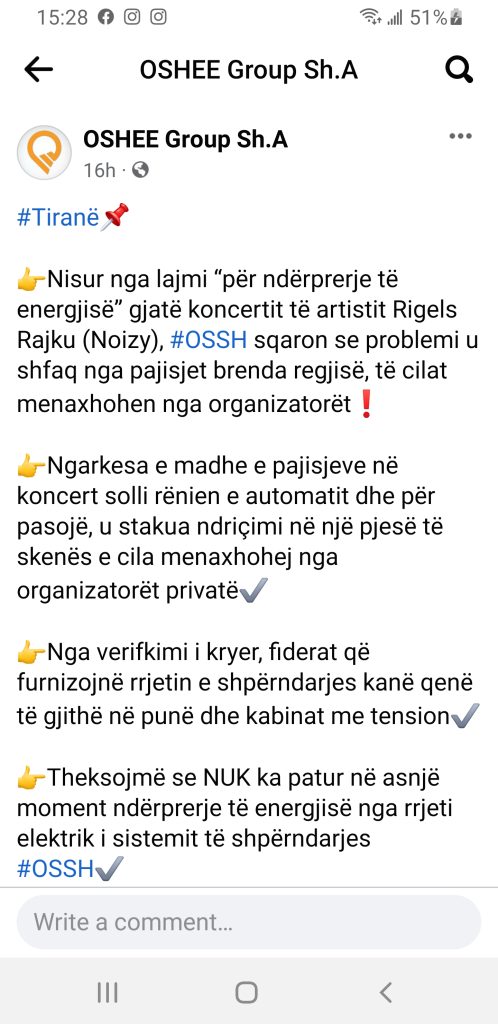‘Nisur nga lajmi “për ndërprerje të energjisë” gjatë koncertit të artistit Rigels Rajku (Noizy), OSSH sqaron se shkaku nuk ishte rrjeti ynë elektrik, por nga rënia e automatit, i cili menaxhohet nga organizatorët.