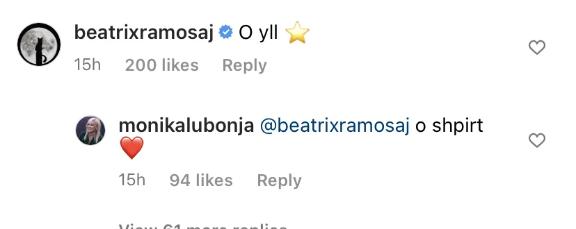 Rikujtojme se Monika ka qenë një nga mbështetëset e mëdha të marrëdhënies Donald Beatrix e sigurisht që nuk ka munguar as komentu i Beatrix. Në foton nga Përputhen Trixa i ka shkruajtur Monikës: o yll!