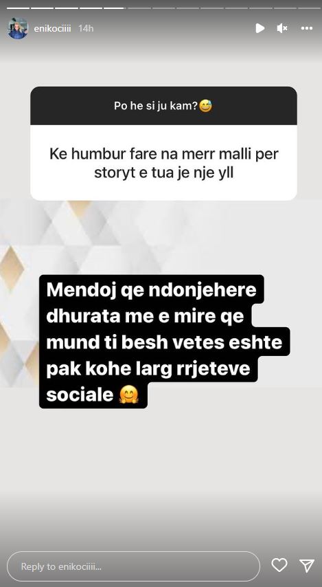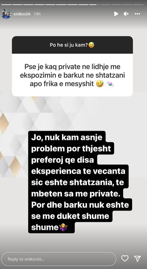 “Përse je kaq private në lidhje me ekspozimin e barkut në shtatzëni apo ke frikën e mësyshit?”- e pyeti një ndjekës, ndërsa Eni u shpreh se dëshiron që këtë ekperiencë të veçantë ta ruajë privatisht, ku shtoi se dhe barku nuk i dallohet shumë.