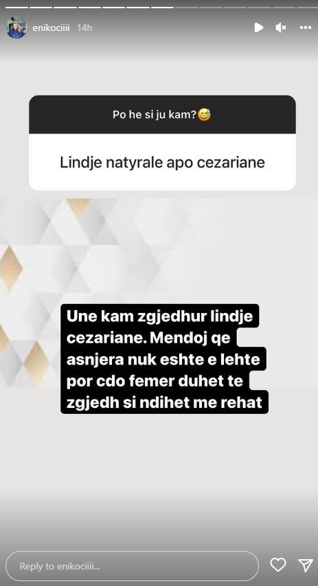 Përsa i përket mënyrës së lindjes, Eni ka zbuluar se do të jetë në metodën cezariane (me operacion) teksa shtoi se ky është një vendim që i takon çdo gruaje që të ndihet sa më mirë.