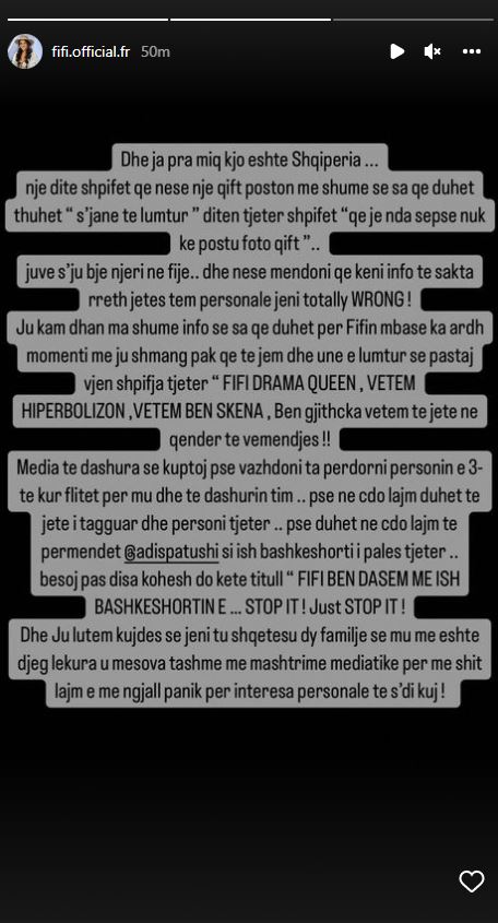 “Dhe ja pra miq kjo eshte Shqiperia.… nje dite shpifet qe nese nje qift poston me shume se sa qe duhet thuhet.” s’”jane te lumtur ” diten tjeter shpifet “ge je nda sepse nuk ke postu foto qift” juve s’ ju bje njeri ne fije… dhe nese mendoni qe keni info te sakta rreth jetes tem personale jeni totally ËRONG! Ju kam dhan ma shume info se sa qe duhet per Fifin mbase ka ardh momenti me ju shmang pak qe te jem dhe une e lumtur se pastaj vjen shpifja tjeter ” FIFI DRAMA QUEEN, VETEM HIPERBOLIZON, VETEM BEN SKENA.