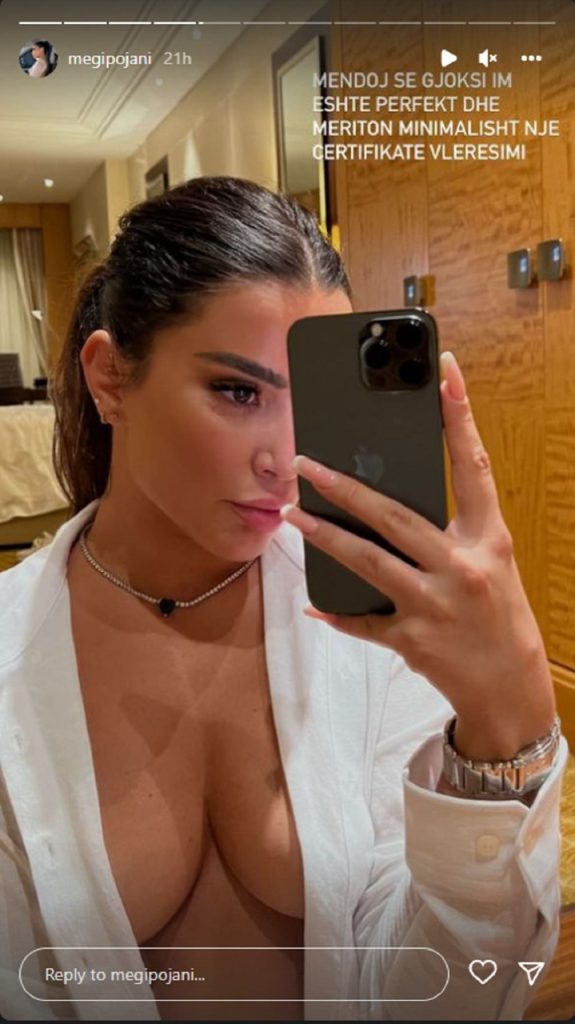Por Megi nuk e ka lënë me kaq, teksa i ka hedhur edhe më shumë “benzinë zjarrit” duke e shoqëruar postimin me shkrimin “Mendoj se gjoksi im meriton minimalisht një certifikatë vlerësimi”.