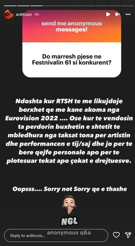 “Ndoshta kur RTSH të më likiudojë borxhet që më kanë akoma nga Eurovision 2022…. Ose kur të vendosin ta përdorin buxhetin e shtetin të mbledhura nga taksat tona për artistin dhe performancën e tij/ saj dhe jo për të bërë qejfe personale apo për të plotësuar teksat apo çokat e drejtuesve. Ops, sorry not sorry që e thashë”– shkruan Arditi.