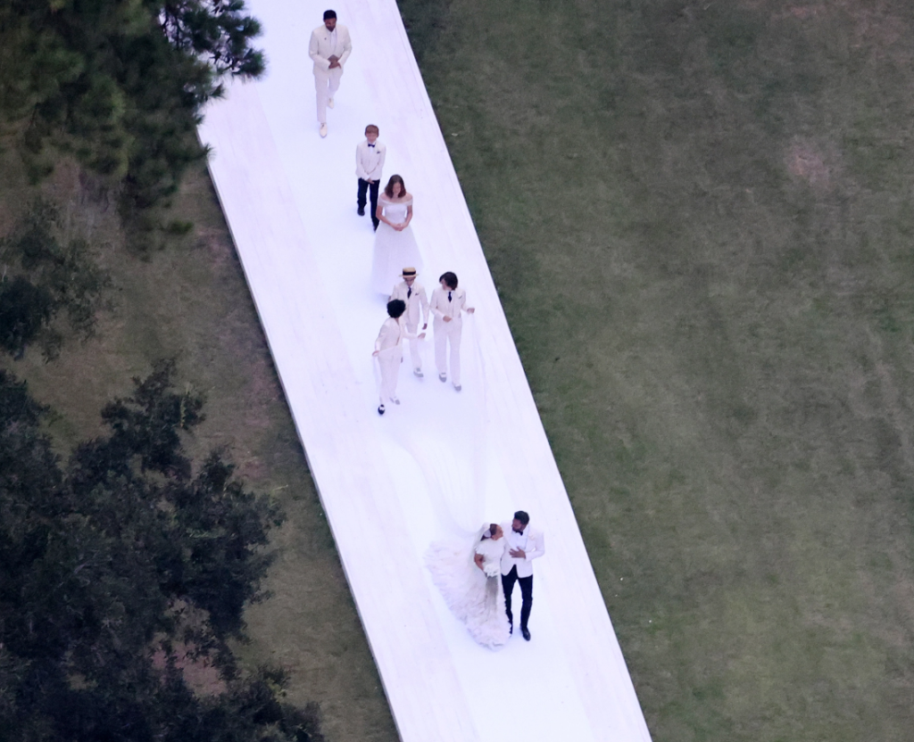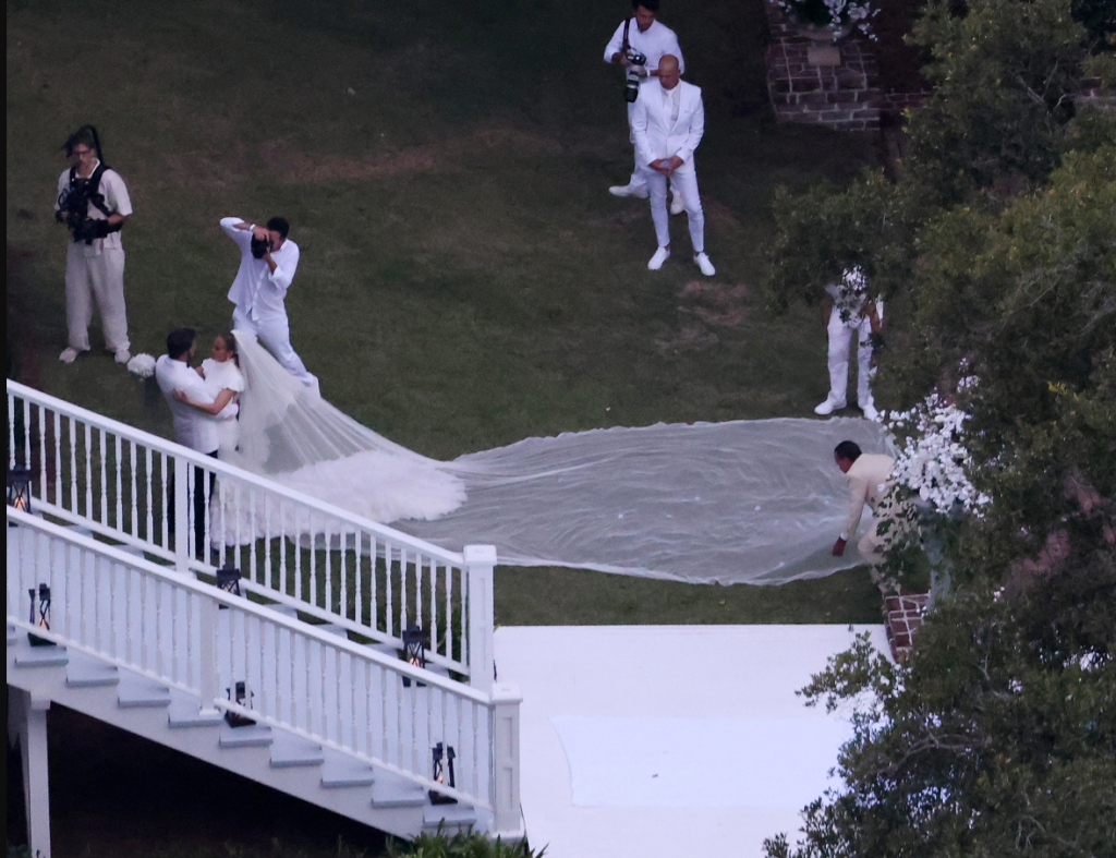Nusja kishte veshur një fustan mahnitës me mëngë të shkurtra me një vello të gjatë që i tregonte format për tu patur zili. Velloja e saj ishte 5 metra e gjatë dhe u mbajt nga të pesë fëmijët e tyre – binjakët 14-vjeçarë të Lopez, Max dhe Emme, si dhe Violet, Seraphina dhe Samuel të Ben.