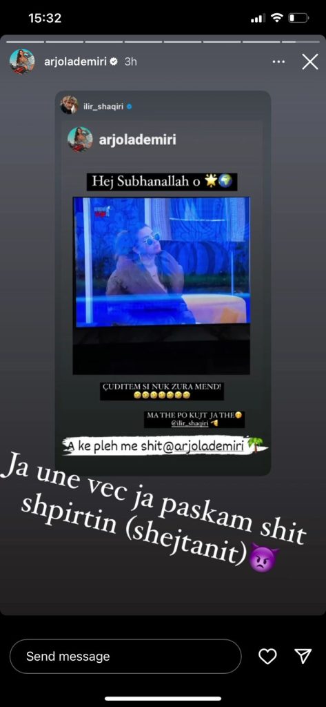 Kjo e fundit ka reaguar në Instastorin e saj duke postuar një foto kur ishte brenda shtëpisë së Big Brother Vip. Krahas imazhit Demiri shkruan: “Hej Subhanallah o yll bote. Çuditem si nuk zura mend. Ma the po kujt ja the,”-shprehet aktorja duke iu drejtuar Ilir Shaqirit.