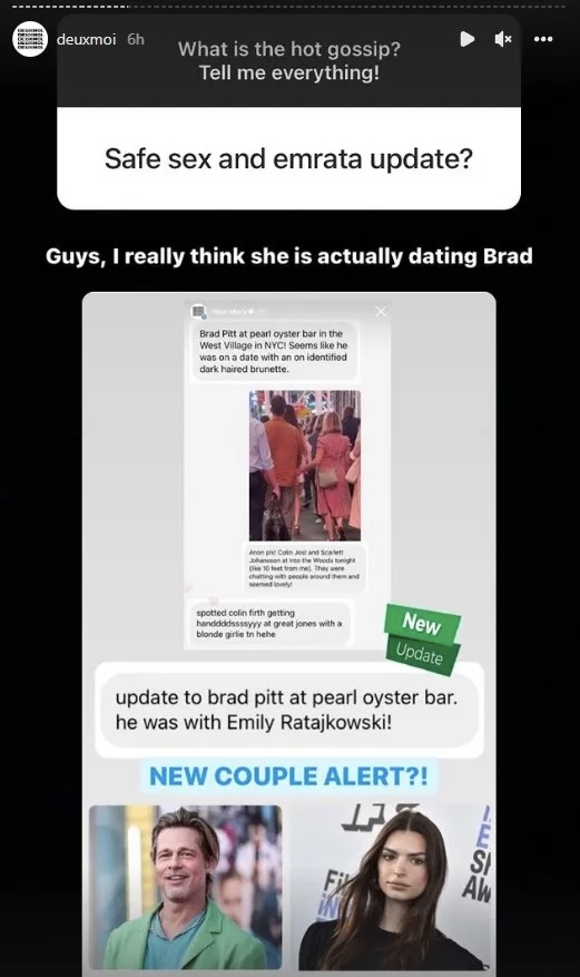 Brad Pitt aktualisht është i angazhuar në një betejë ligjore me ish-bashkëshorten e tij Angelina Jolie ndërsa Emily Ratajkowskisi është ndarë bashkëshorti i saj Sebastian Bear-Mcclard me të cilin ishte e martuar që nga viti 2018 dhe me të cilin ka edhe një fëmijë. Nuk dihet ende se si qëndron e vërteta, pasi nuk ka ende asnjë reagim nga ana e Pitt dhe modeles.