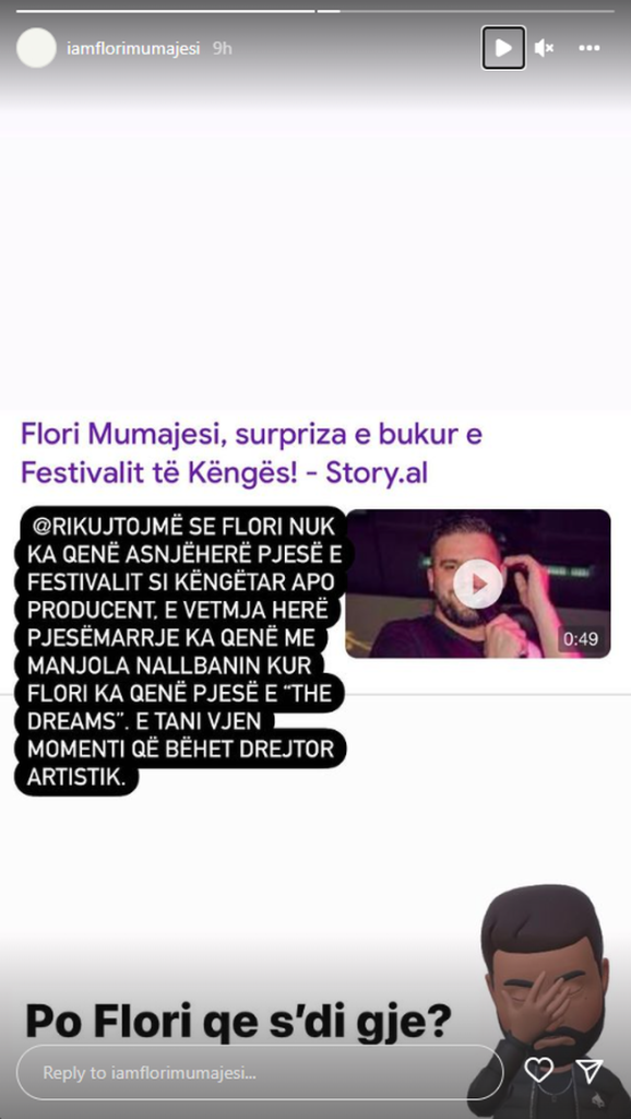 Por, duket se diçka e tillë nuk është e vërtetë. Të paktën për Florin. Ky i fundit ka reaguar për herë të parë rreth lajmeve në rrjetet sociale. Ai ka ndarë në Instastory një titull të një mediaje ku shkruhaet: “Flori Mumajesi surpriza e bukur e Festivalit të Këngës”. Krah tij ka shkruar edhe një pjesë nga teksti ku thuhet: “Flori nuk ka qenë asnjëherë pjesë e Festivalit si këngëtar apo producent, e vetmja pjesëmarrje e tij ka qenë me Manjola Nallbanin kur Flori ka qenë pjesë e “The Dreams”.