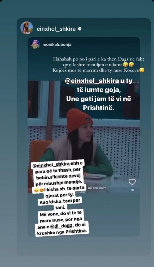 Së fundmi edhe Einxhel ia ka kthyer në të njëjtën monedhe Monikës, ku krahas një videoje brenda shtëpisësë Big Brother Vip, ku aktorja “parashikonte” shtatzëninë e Shkirës shkruan: “Po po i pari e ka thënë Dagz në fakt që e kishte mendjen e ndame. Kujdes mos të marrim edhe ty nuse Kosove.”
