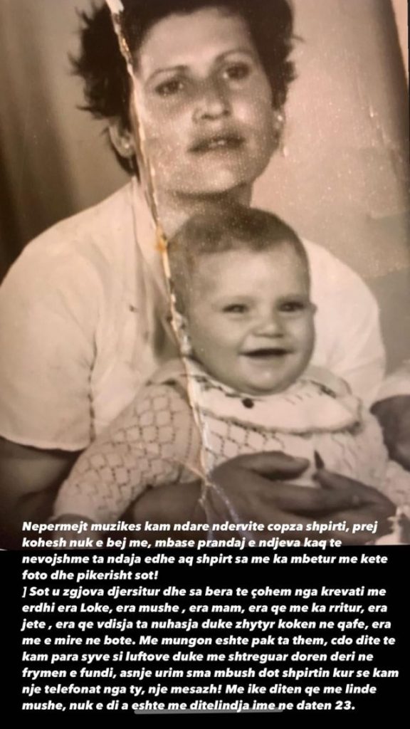 “Nëpërmjet muzikës kam ndarë ndër vite copëza shpirti, prej kohësh nuk e bëj më, mbase prandaj e ndjeva kaq të nevojshme ta ndaja edhe aq shpirt sa më ka mbetur me këtë foto dhe pikërisht sot! Sot u zgjova djersitur dhe sa bëra të çohem nga krevati më erdhi era Loke, era mushe, era mam, era që më ka rritur, era jetë, era që vdisja ta nuhasja duke zhytur kokën në qafë, era më e mirë në botë.