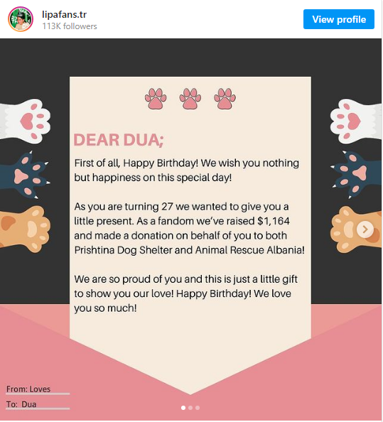Disa fansa kanë grumbulluar mbi 1 mijë dollarë për një kauzë shumë të veçantë. Paratë kanë shkuar për dy organizata në Prishtinë dhe Tiranë që ka për qëllim kujdesjen ndaj kafshëve. Kujtojmë që Dua pritet të këndojë këtë fundjavë në kryeqytet për festivalin Sunny Hill.