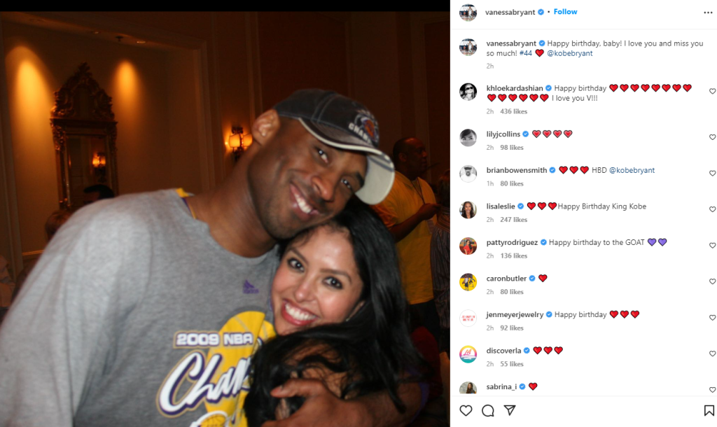 Vanessa përkujtoi ditën e tij të veçantë duke shpërndarë një foto duke përqafuar yllin e ndjerë të ‘Los Angeles Lakers’ pasi ekipi i tij fitoi Kampionatin NBA në 2009. “Gëzuar ditëlindjen, zemër!” shkroi ajo krah postimit në Instagram. “Të dua dhe më mungon shumë! #44.” Në pjesën e komenteve të postimit të Vanessa-s, Kobe mori urime për ditëlindje nga disa yje, duke përfshirë këngëtaren Monica, e cila shkroi, “Gëzuar ditëlindjen Kobe” dhe supermodelja Naomi Campbell, e cila komentoi disa emoji me zemër të kuqe dhe tortë. Ish-ylli i WNBA-së Lisa Leslie shkroi, “Gëzuar ditëlindjen Mbreti Kobe“, ndërsa Khloe Kardashian i dërgoi mbështetjen e saj Vanessa-s, duke shkruar: “Gëzuar ditëlindjen. Të dua V!!!”