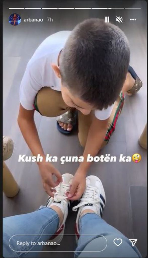 Arbana ka postuar një foto në InstaStory-t e saj, ku shfaqet Joni duke e ndihmuar, më saktë duke i lidhur këpucët dhe ky ishte një moment që e ka bërë krenare moderatoren. “Kush ka çuna, botën ka”- shkruan Osmani bashkangjitur fotos.