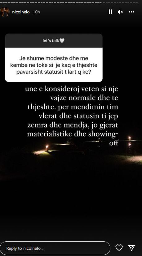 “Unë e konsideroj veten si një vajzë normale dhe të thjeshtë. Për mendimin tim vlerat dhe statusin t’i jep zemra dhe mendja, jo gjërat materialistike dhe të tregosh gjëra”- u shpreh Nikol.