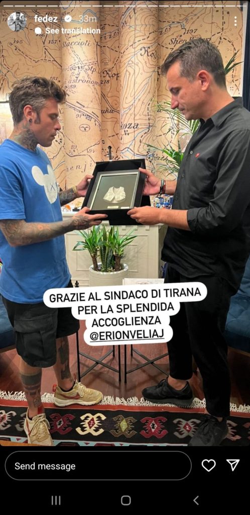 Edhe Fedez ka postuar në Instagram një foto me Veliajn duke shkruar: “Faleminderit kryetarit të Bashkisë për pritjen e shkëlqyer”.
