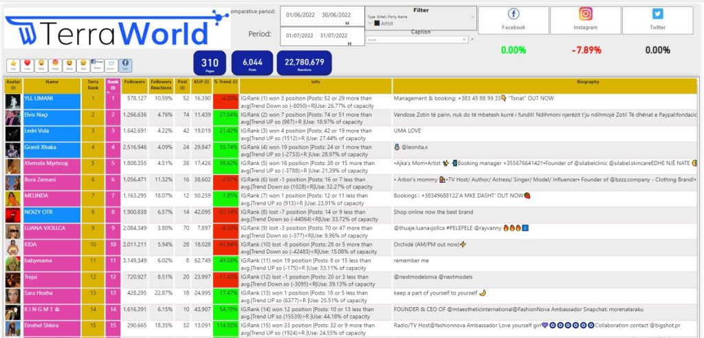 “Terra World” ka paraqitur të dhënat e ndjekësve, postimeve, trendeve për Instagramin, nga muaji qershor deri në korrik. Ylli Limani shihet se ka fituar tre pozicione në Instagram megjithatë ka pësuar rënie sepse nuk ka qenë ‘trend’. Elvis Naçi renditet i dyti duke fituar 7 pozicione dhe po ashtu ka qenë në rritje edhe si trend.