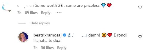 “2 euro”, ka shkruar këngëtarja duke nënkuptuar se i referohet ish të dashurit të saj dhe Borës. Një ndjekëse i ka shkruar: “Disa vlejnë 2 €, disa janë të paçmueshme”, së cilës këngëtarja i është përgjigjur menjëherë. “Damn! E rond! Hahaha të dua!”, ia ka kthyer Trixa.