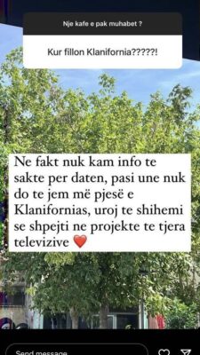 “Në fakt nuk kam info të saktë për datën, pasi unë nuk do të jem më pjesë e Klanifornias, uroj të shihemi së shpejti në projekte të tjera televizive”, ka shkruar Eliona duke konfirmuar largimin.